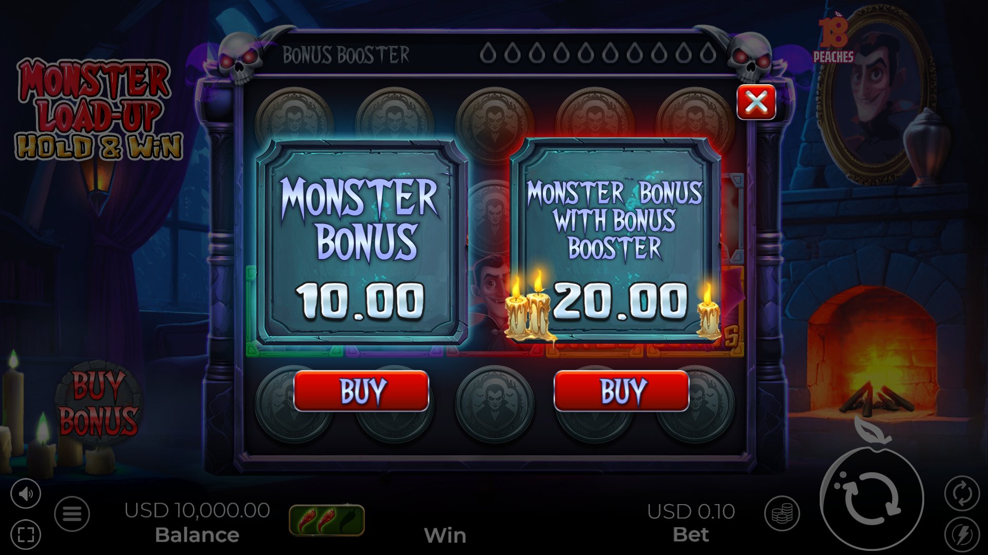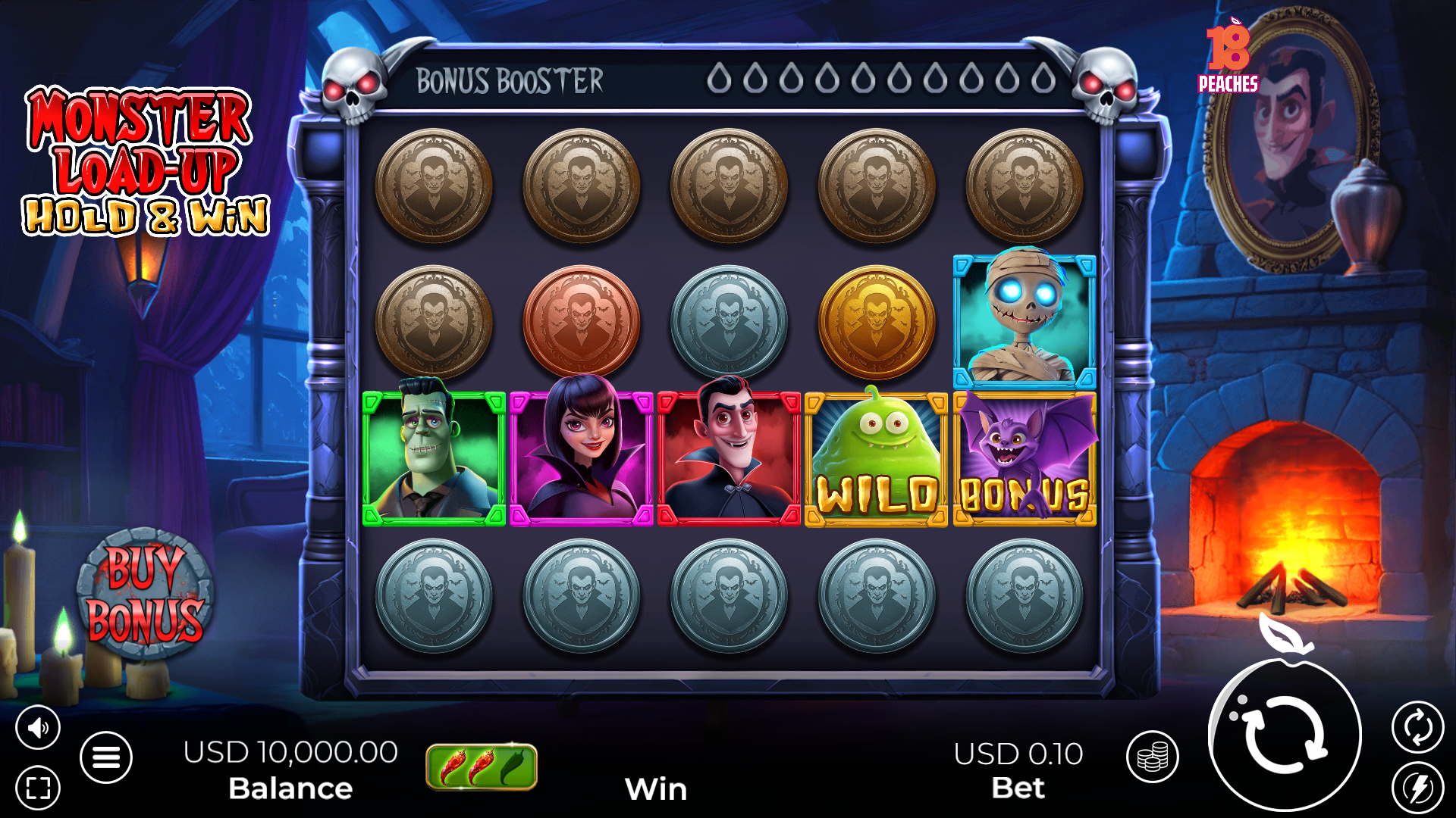 Welcome to the world of Dracula, as imagined by the online casino game provider 18Peaches in its slot creation titled Monster Load-Up Hold & Win. From the very first time you load this game, it’s evident that this provider went to great lengths to ensure Monster Load-Up Hold & Win would appeal to players not just during the Halloween season, but throughout the entire calendar year as well. That’s because this particular casino game starts off with a fantastic introduction video that really helps set the stage for what’s to come as you begin to spin the reels.