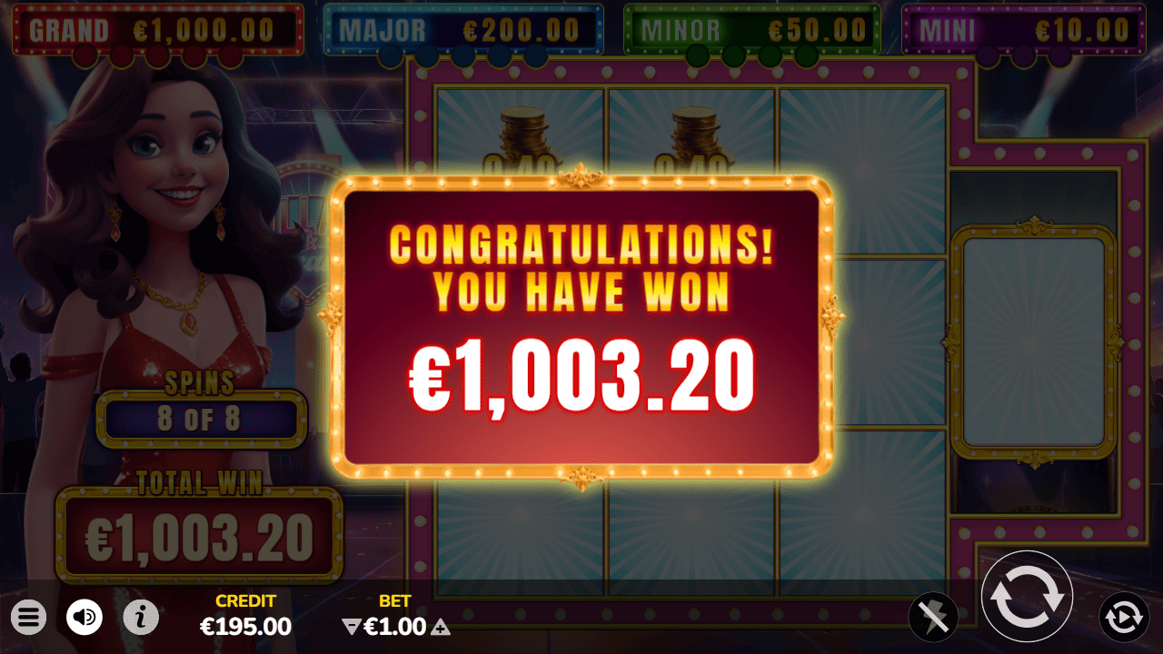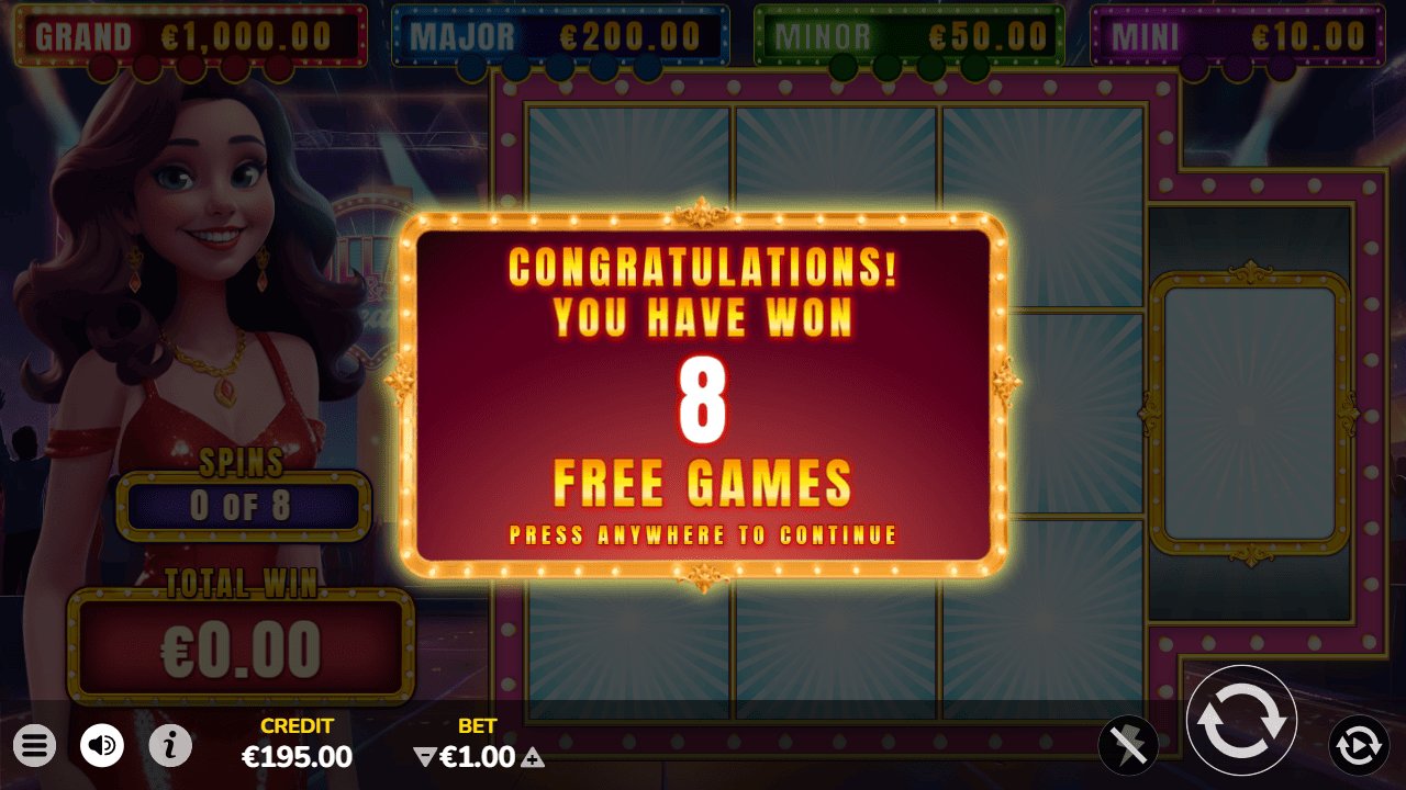 The feature is presented by an attractive animated hostess, as if the player were a contestant on a live TV show. Upon activation, the player receives eight free games that are played on a dedicated 3x3 grid with a specialized set of rules.