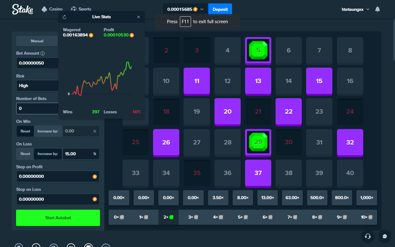 If Plinko is suspense you can watch bouncing around, Mines is suspense you create with your own hands. It’s a grid. Some tiles are safe. Some tiles are mines. You choose how many mines you want on the board, and that choice basically sets the difficulty and the size of the payout.